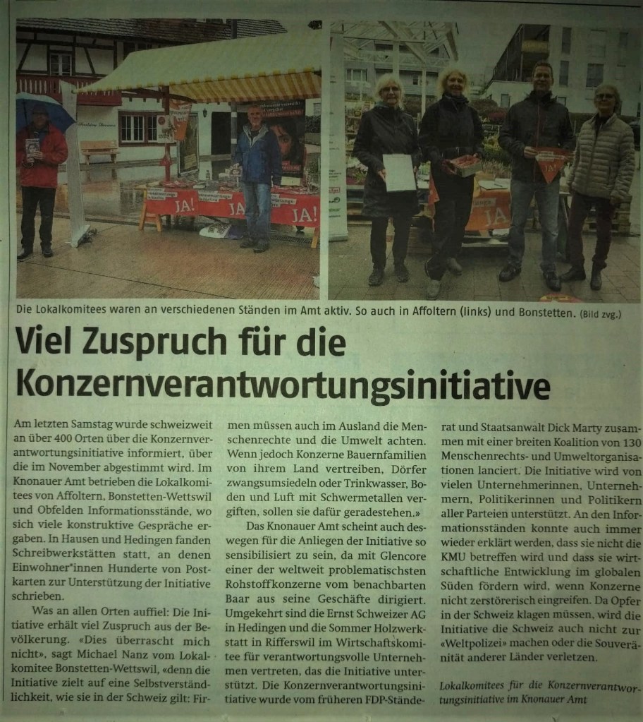 Schaut ihn euch an, bildet euch eine Meinung und verbreitet die Info bitte in eurem Umfeld: Wir stimmen am 29. November 2020 darüber ab, ob schweizer Konzerne weiterhin ungestraft schweizer Gesetze verletzen dürfen, solange diese im Ausland stattfinden. Mit der Konzernverantwortungsinitiative soll damit Schluss sein.